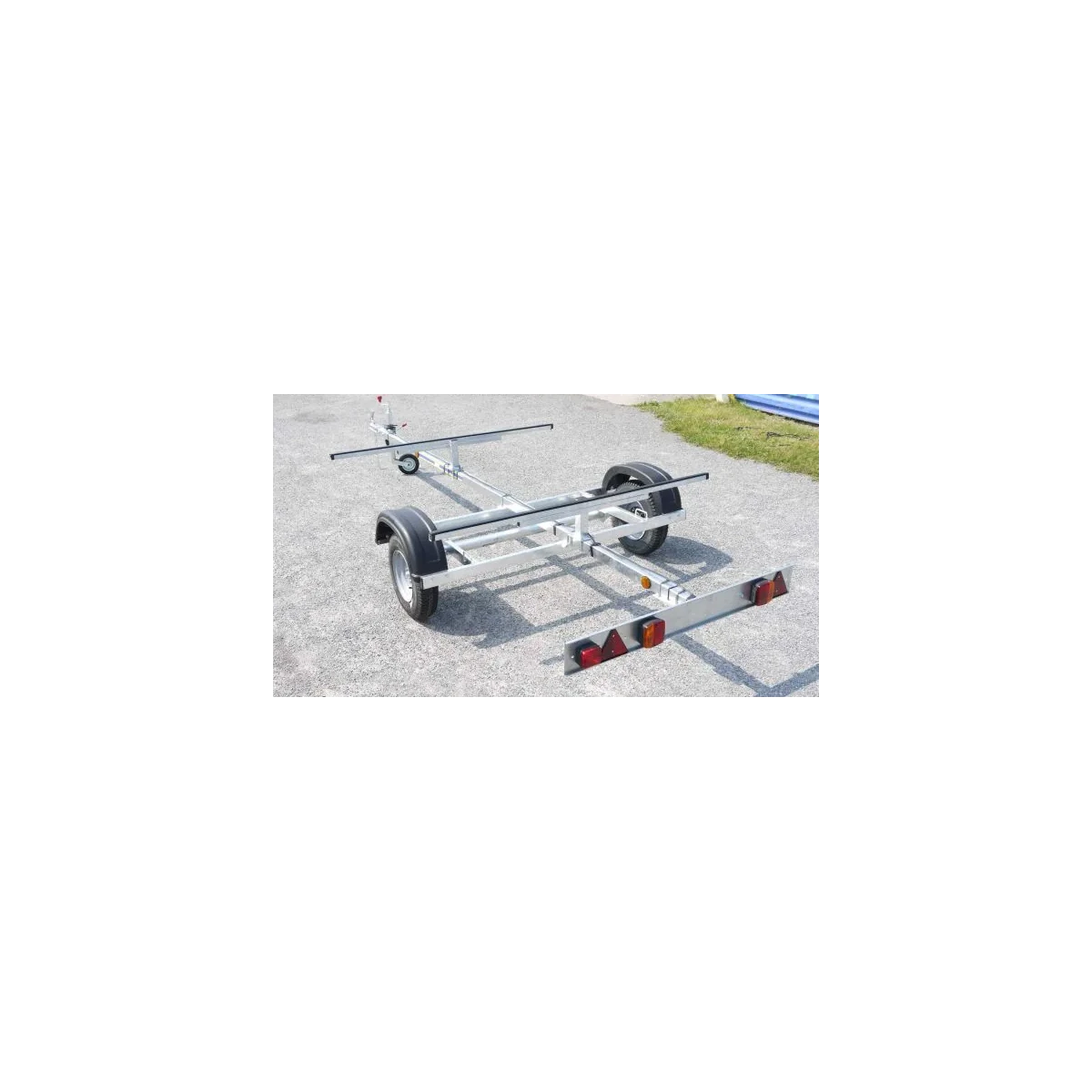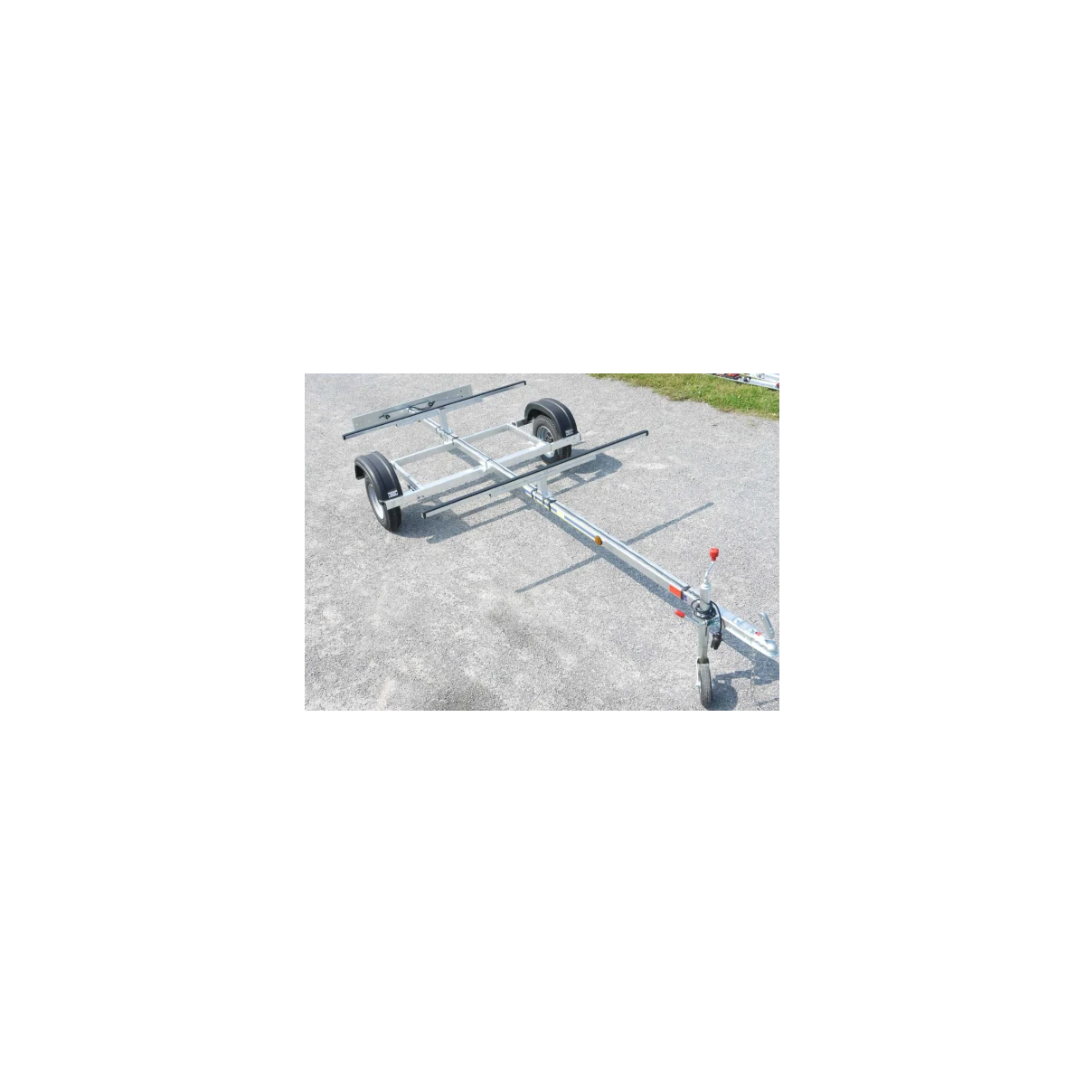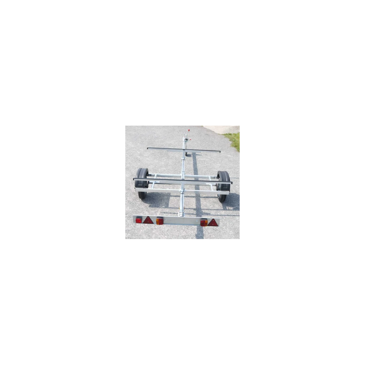 Cette remorque de route dispose de deux supports horizontaux. déplaçables sur toute le longueur de la barre centrale.